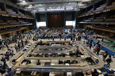 ただいま設営中の大ホール・・・。ここが明日は模型とお客様でいっぱいになります。