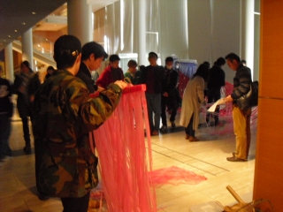 いくつもの色の違う帯を並べた装飾物を、1枚の絵に見えるように順番に吊るしていきます。