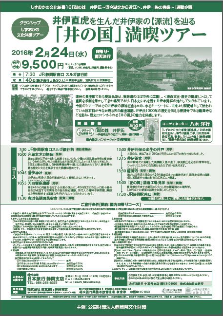 今回のツアーではその井伊家の源流を辿るため、水をキーワードに、古来より祭祀場として使われていた巨石群がいまなお残る天白磐座遺跡、井伊氏1000年の歴史を伝える菩提寺である龍潭寺などを訪ね、歴史ロマンあふれる「井の国」の魅力を体感します。