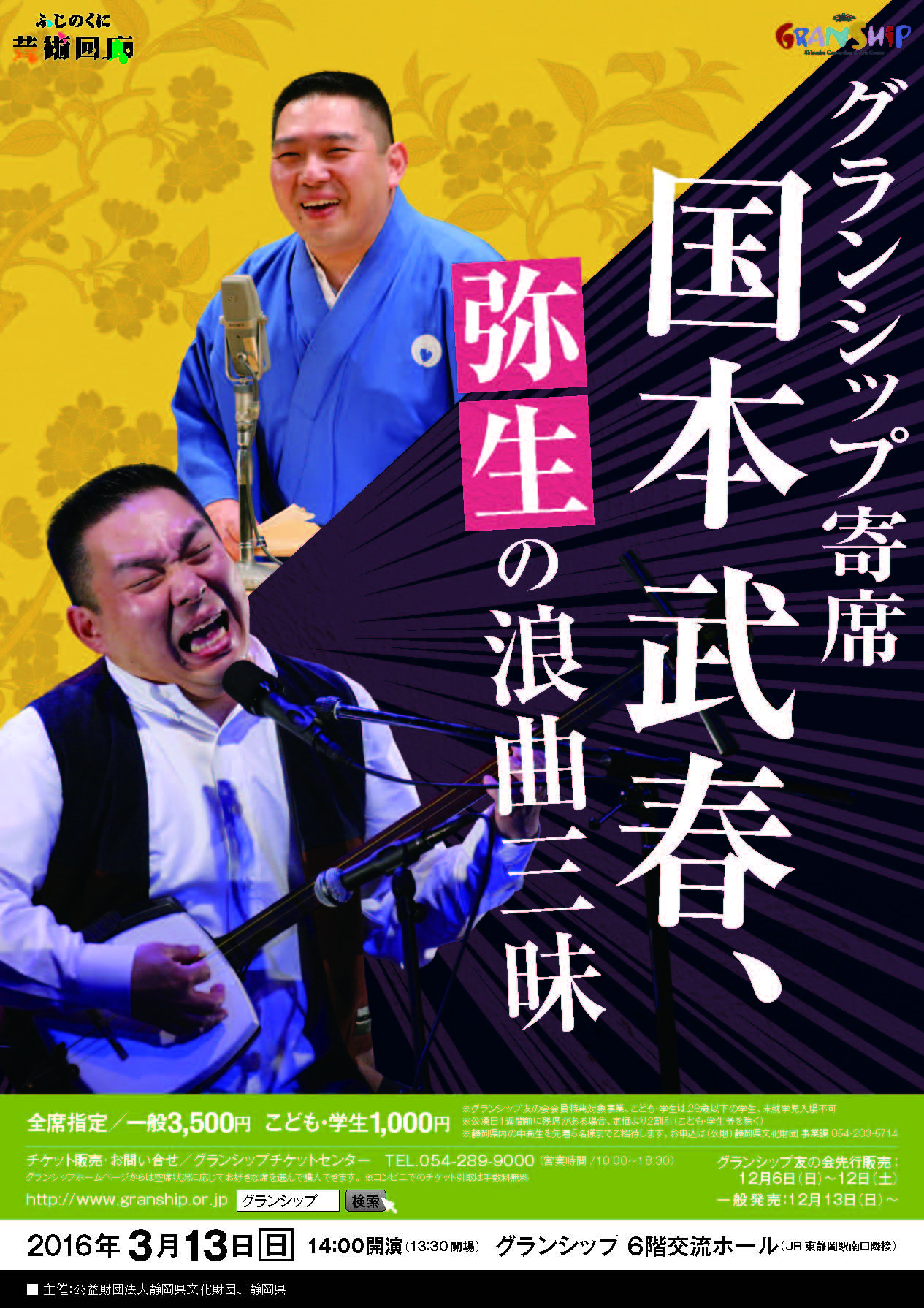 うなるカリスマ!浪曲師・国本武春の独演会。伝統的な浪曲から、ロックのリズムで三味線をかき鳴らすオリジナルスタイルまで、浪曲の魅力をたっぷりとお届けします。