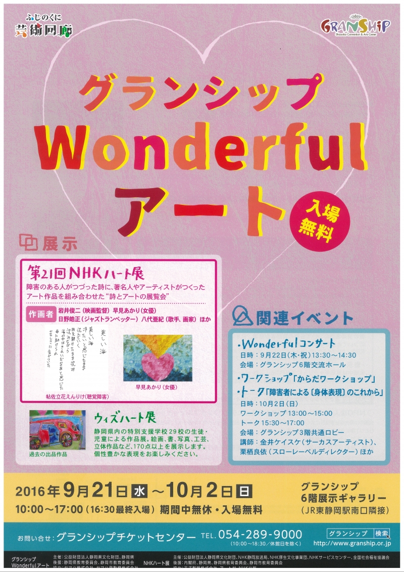 今年のグランシップWonderfulアートは、詩とアートの展覧会の「NHKハート展」、県内特別支援学校の生徒・児童の作品を展示する「ウィズハート展」、誰でも気軽に楽しめる「Wonderfulコンサート」、NPO法人スローレーベルによるワークショップ&トークと、様々な芸術表現の世界をお楽しみいただけます。