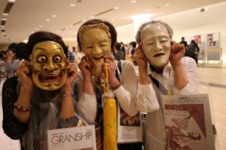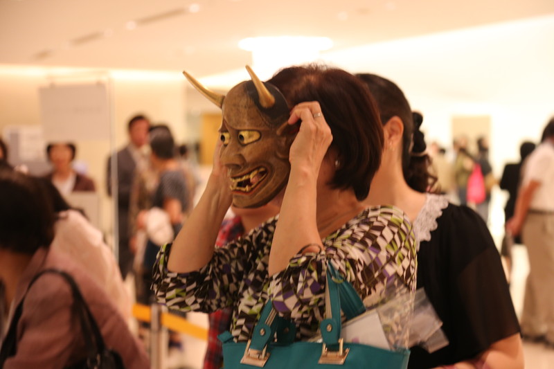 また、開場ロビーでは、能面を実際に手にとって付けることのできる「能面体験コーナー」も大人気でした。
