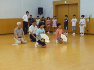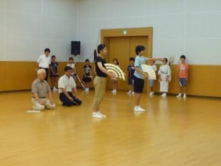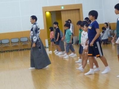 先生の真似をしながら、謡を体験し、後半には能楽の基本となる摺り足にも挑戦しました。