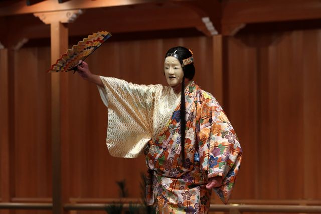 若い女性を演じるときに身にまとう装束には、紅色が使われ、紅色がない緑や青、紫などの色の装束は、中年以上の女性を表しています。