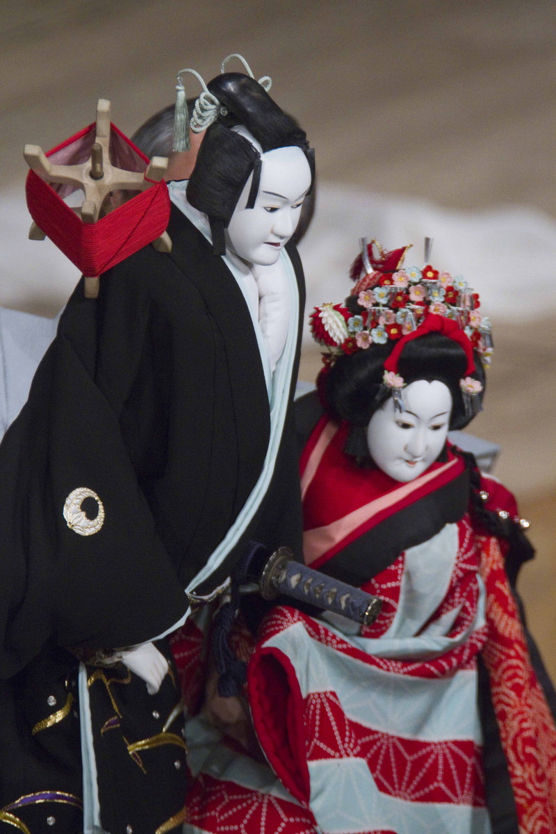 【堀川猿廻しの段】しかし、現場に落ちていた小刀から伝兵衛が犯人と知れ、目下、詮議の真最中。おしゅんはひそかに店から実家に戻されました。老母と兄が恐れるのは、追い詰められた伝兵衛が心中を決意し、おしゅんを殺しに来ること。そこで妹に絶縁状を書かせ、安心した二人が寝入ったその夜、おしゅんと一緒に死ぬため、伝兵衛が忍んで来ました。妹を守ろうと与次郎が手渡した絶縁状は、実は家族に宛てた書置き。あくまでも伝兵衛への愛を貫き、死をもいとわないおしゅんに心を打たれた老母は、できるだけ二人が生き延びることを願いながら、娘を伝兵衛に託し、与次郎も猿廻しで二人の門出を祝福、今生の別れを告げるのでした。