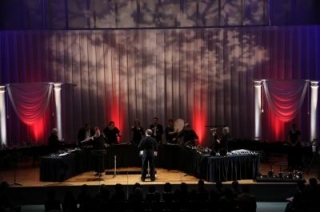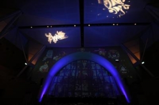 国際会議場としても使用される会場ですが、本日は大きなステンドグラスの映像で大聖堂に変身!開演を知らせるベルもクリスマス仕様でお届けしました。