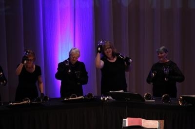 ハンドベルにも様々な種類があり、片手に二つ持って演奏できるようなサイズのものから、両手でないと持てないほどの大きさのものも。また、演奏方法も、手に持って鳴らすほか、マレットで叩いて鳴らしたりテーブルに置いて鳴らしたりと様々なテクニックを見ることができました。