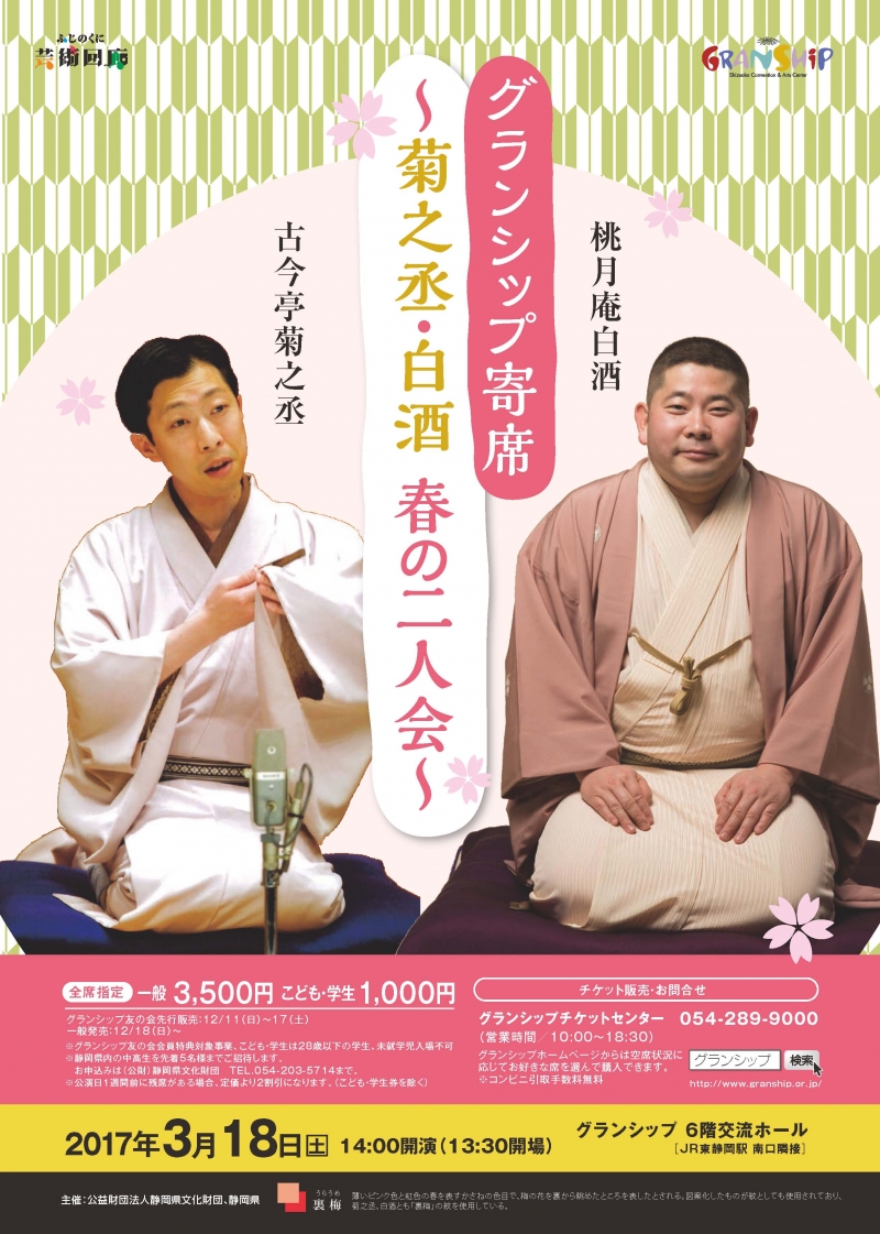 今回の「グランシップ寄席」は、この勢いのある落語ブームを牽引している人気落語家が登場。端正な顔立ちと柔らかい物腰、独特の色気と艶っぽい語り口で女性ファンも多い古今亭菊之丞と、愛嬌のあるキャラクターと滑らかな語り口で客席を魅了する桃月庵白酒の二人会でお届けします。