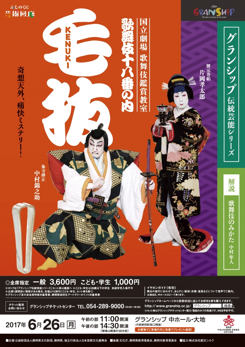 一般3,600円 ⇒直前割引2,880円 こども・学生1,000円 *車椅子席をご希望の方は、グランシップチケットセンター(054-289-9000)へお電話でお申し込みください。 グランシップ伝統芸能シリーズセット券 10,000円 <グランシップ伝統芸能シリーズセット券> ※セット券は完売しました 初心者から伝統芸能ファンまで満足の多彩なラインナップ。数量限定、お早めに。 ①6/26(月)「国立劇場 歌舞伎鑑賞教室」午前の部11:00~または午後の部14:30~ ②9/23(土・祝)「グランシップ静岡能 能楽入門公演」14:00~ ③10/7(土)「人形浄瑠璃 文楽」昼の部(「桂川連理柵」)13:30~または夜の部(「曽根崎心中」)18:00~ ④2018/1/27(土)「グランシップ静岡能」(宝生流「半蔀」「鉄輪」)14:00~ ①~④の合計13,300円をセットで10,000円で販売。 ※セット券は電話(054-289-9000)またはグランシップチケットセンター窓口のみで販売。WEB販売はありません。 ※数量限定、予定枚数に達し次第終了。 |