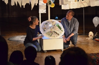 白い砂漠、空で踊るオーロラ、回転する街・・・。この星で起きているさまざまな現象、情景をたくさんの道具、音楽、映像を使って美しく表現。こどもたちの目を世界へ開かせてくれるパフォーマンス。