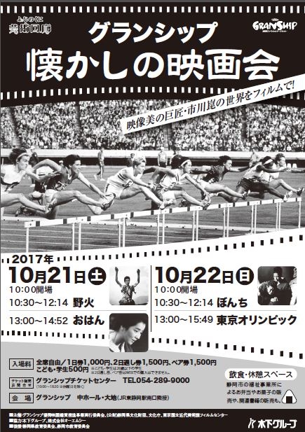 10月21日(土)・22日(日)に開催する「グランシップ懐かしの映画会」では、市川崑監督の「野火」、「おはん」、「ぼんち」、「東京オリンピック」の4作品を上映します。