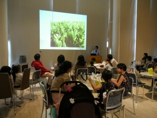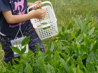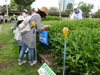 グランシップ芝生広場に生育している茶樹の葉の摘み取り体験。