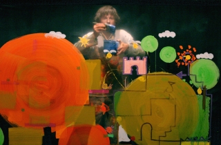透明の大きなキャンバスに、ブラシやローラーを使ったクリエイティヴなテクニックと幻想的なストーリーに、こどもはびっくり!大人は感動!