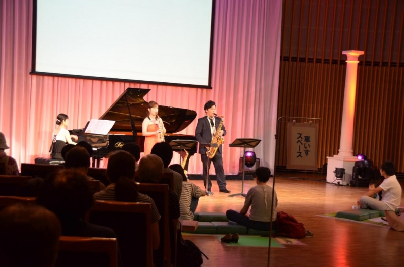 演奏するのはグランシップアウトリーチ登録アーティスト。初日はピアノとサクソフォン2名によるTrio Wings(トリオウイングス)