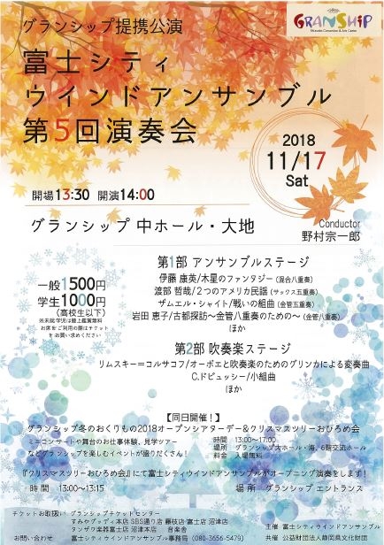 静岡県内を中心に活動しているプロの音楽家で結成された少人数吹奏楽団「富士シティウインドアンサンブル」の第5回演奏会。様々な編成による管楽器アンサンブルをお届けします。