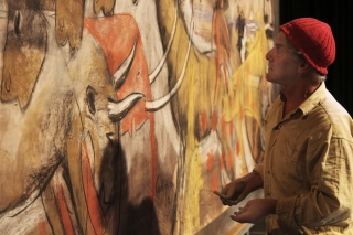 幅5mもある大きなキャンバスに描いては消し、新しく描き足しては再び消され、絵が次々と変化していきます。