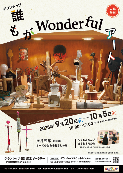 「グランシップ誰もがWonderfulアート」は、障がいの有無を越え、誰もが持つ豊かな感性や個性を認め合う場となることを願い開催しています。静岡ゆかりの芸術家と県内特別支援学校の児童・生徒の皆さんの作品を通して、創作の喜びに触れ、多彩な表現と出会える展覧会です。