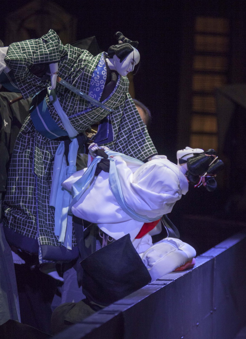 お初が店の縁の下に徳兵衛を潜ませ、足で心中の意思を伝える「天満屋」、「この世の名残、夜も名残…」と名文として知られる道行に始まり、悲しくも美しい心中で終わる「天神森」、二人の心の強い結びつきが感動を呼び、海外でも絶賛されています。