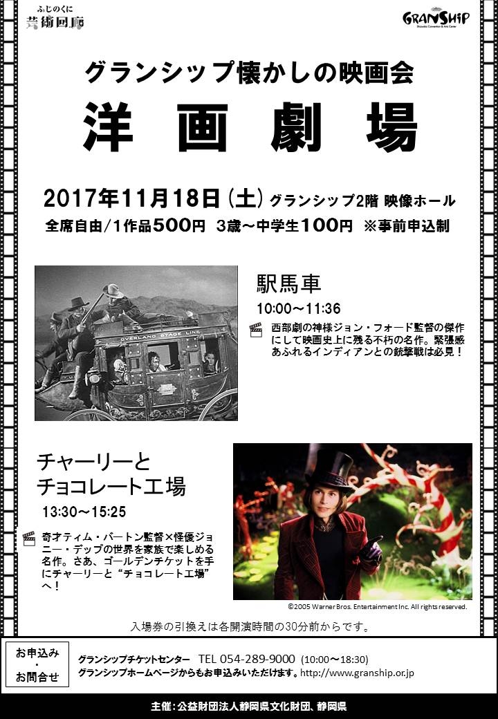 11月18日(土)に開催する「グランシップ懐かしの映画会 洋画劇場」は、西部劇の神様ジョン・フォード監督の最高傑作「駅馬車」と、鬼才ティム・バートンの怪作「チャーリーとチョコレート工場」をお送りします。