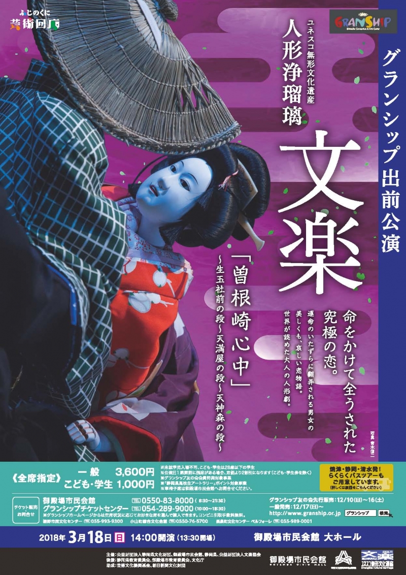 | 主催 | 公益財団法人静岡県文化財団、御殿場市民会館、静岡県、公益財団法人文楽協会 |