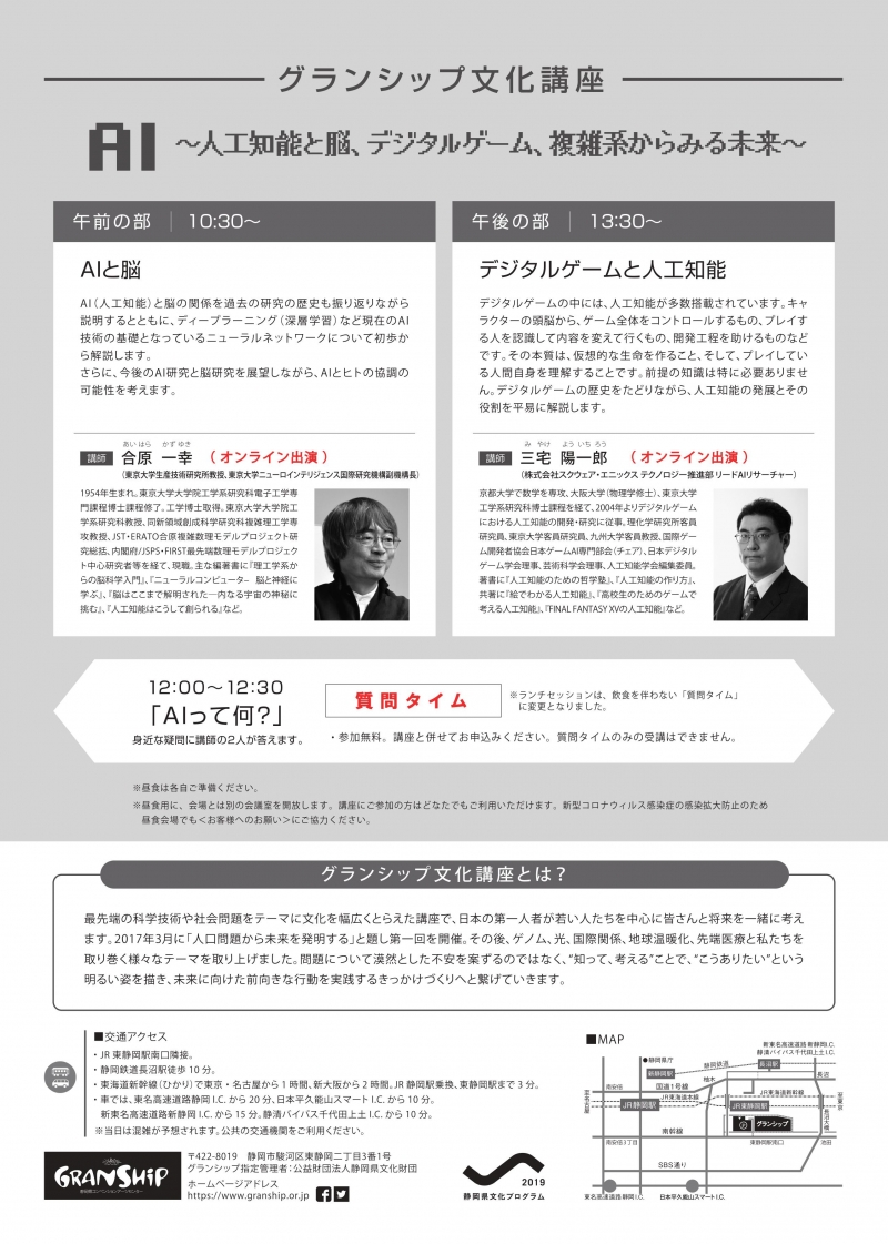 新型コロナウイルス感染症の影響で、開催を延期し、ようやく本日、6/27(土)グランシップ文化講座「 AI 」を開催できました。