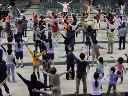 ミニ・コンサートの後、ブレインジムや発声練習を体験。