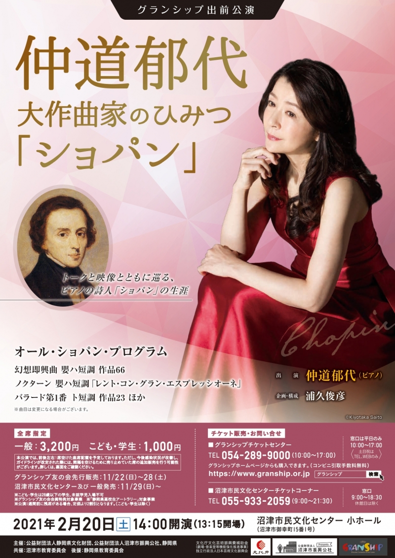 静岡県出身で日本を代表するピアニスト 仲道郁代による演奏、ショパンにまつわるトークそして様々な映像とともにお届けします。