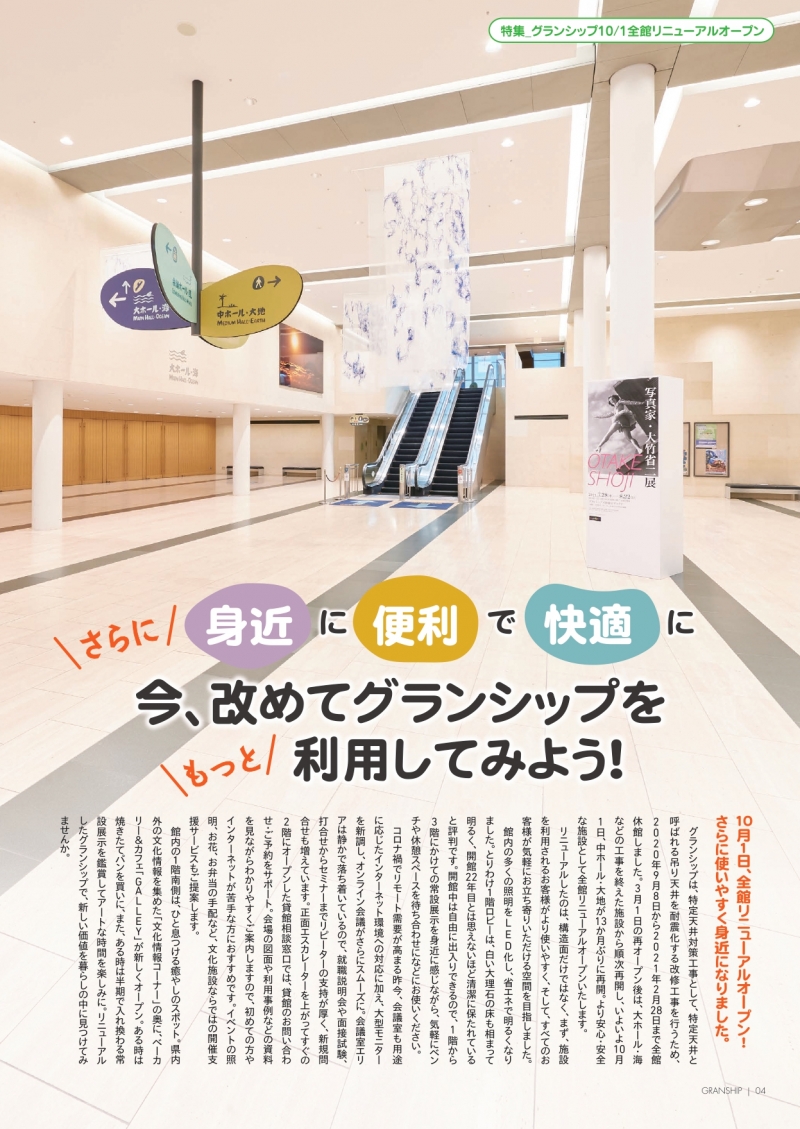 グランシップは、特定天井対策工事として、特定天井と呼ばれる吊り天井を耐震化する改修工事を行うため、2020年9月8日から2021年2月28日まで全館休館しました。3月1日の再オープン後は、大ホール・海などの工事を終えた施設から順次再開し、いよいよ10月1日、中ホール・大地が13か月ぶりに再開。より安心・安全な施設として全館リニューアルオープン。
