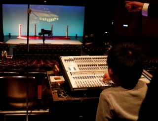 舞台で使う本物の機材に触れてみよう。映像や、ステージに照明をあてる体験も。