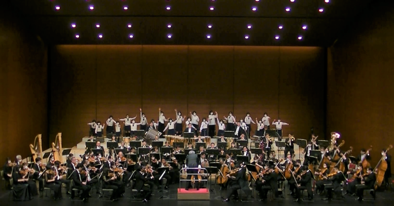 ラストでは大岡信さんの詩「産卵せよ富士」から抜粋した歌詞のイメージも伴い、富士山が秘めている大きなエネルギーが鳴動するように盛り上がり、合唱団の掛け声に合わせて、指揮者もオーケストラも静止。一瞬ですが、絵画のように記憶に残る光景でした。