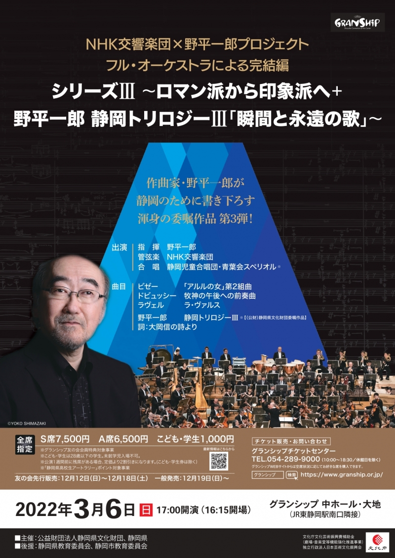 世界で活躍する作曲家・ピアニストの野平一郎(静岡音楽館AOI芸術監督)が、静岡県のために作曲した三部作を締めくくる「静岡トリロジーⅢ『瞬間と永遠の歌』」(公益財団法人静岡県文化財団委嘱作品)をNHK交響楽団の演奏で世界初演します。