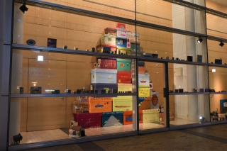 占部史人の『Life in the Boxes』は、一昨年の「めぐるりアート静岡」から始まりました。新型感染症によって部屋にこもらざるを得ない日々に着想したようです。自粛生活のなかで占部は、19世紀のアメリカの思想家・詩人、H.D.ソローの著作『森の生活』に向き合い、自身を見つめなおし、大切なものについて思いをめぐらせたとのこと。そしてその気持ちをカタチにするために、これまで作った作品に一つずつ箱を作り、納めてゆきました。本展示では、コロナ禍の2年間に作られた「箱」をすべて搬入。ショーウィンドウ西側にはそれら様々な箱を、東側にはその中に入っていた作品を繰り広げています。瑞々しい絵心や喜びに満ちた工作の数々。しかしそれらは単に楽しいだけでなく、消費社会の「廃品」を用い、そこに刻印された時の流れも含め作品に転生させています。それはポストコロナに向けた心の弾力なのかもしれません。