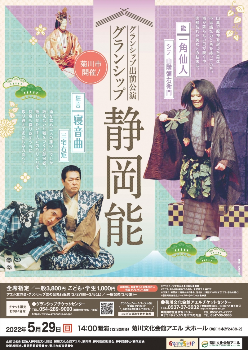 | 主催 | 公益財団法人静岡県文化財団、菊川文化会館アエル、静岡県、静岡県能楽協会、静岡新聞社・静岡放送 |