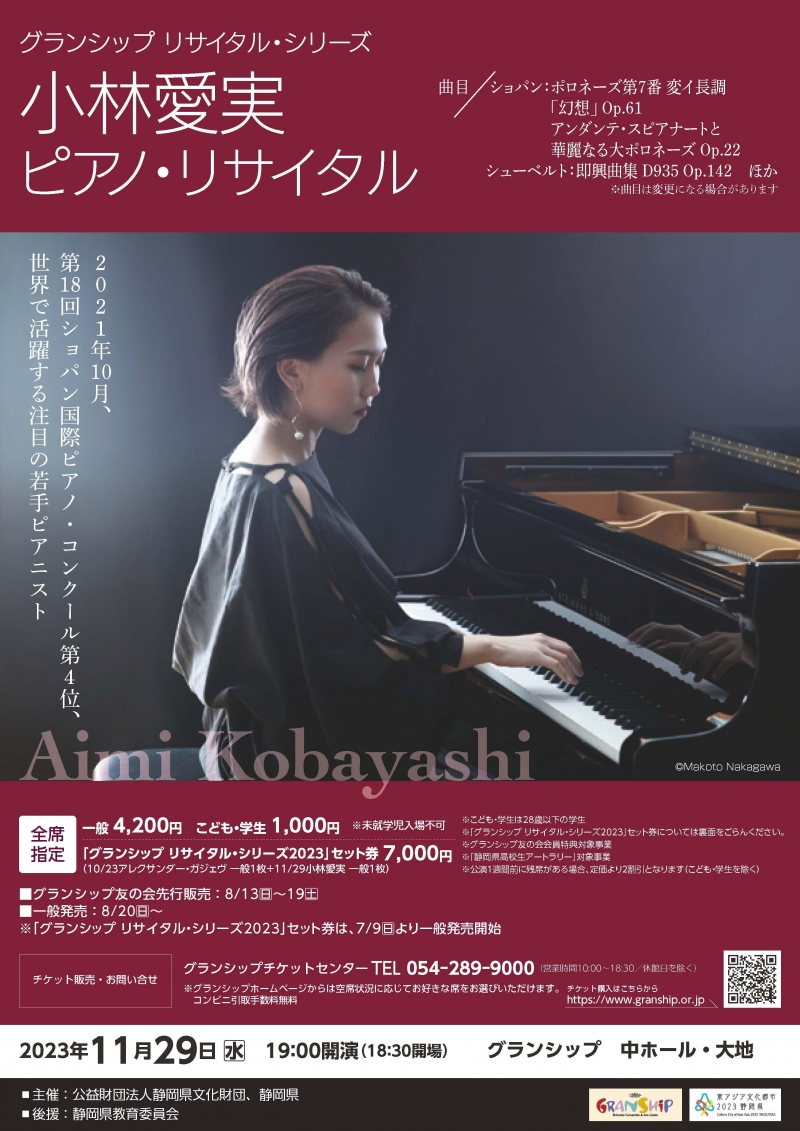 ◆当日券は11/29(水)18:00より中ホール前にて販売。(若干数) 全席指定:一般4,200円 ⇒ 直前割引価格 3,360円 こども・学生1,000円 ※未就学児入場不可、こども・学生は28歳以下の学生 ● 「グランシップリサイタル・シリーズ2023」セット券 <セット券の販売は終了しました> 2021年ショパン国際ピアノコンクール入賞者のリサイタルをお楽しみいただける贅沢なセット券。 枚数限定、お早めに。 ①10/23(月)19:00~ 中ホール・大地 「アレクサンダー・ガジェヴ ピアノ・リサイタル」(一般4,200円) ②11/29(水)19:00~ 中ホール・大地 「小林愛実 ピアノ・リサイタル」(一般4,200円) ①+②をセットで購入すると7,000円! セット券は、グランシップチケットセンターまたはグランシップホームページのみで販売 友の会先行販売:7/2(日)~8(土) 一般発売:7/9(日)~ ※<数量限定>先行販売分、一般販売分とも予定枚数に達し次第終了。予約後の変更、キャンセル不可。 ※こども・学生のセット券は2公演で2,000円 ※おひとり様5セットまで購入可。 ※単公演購入後にセット券への変更はできません。 |