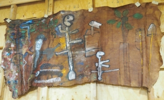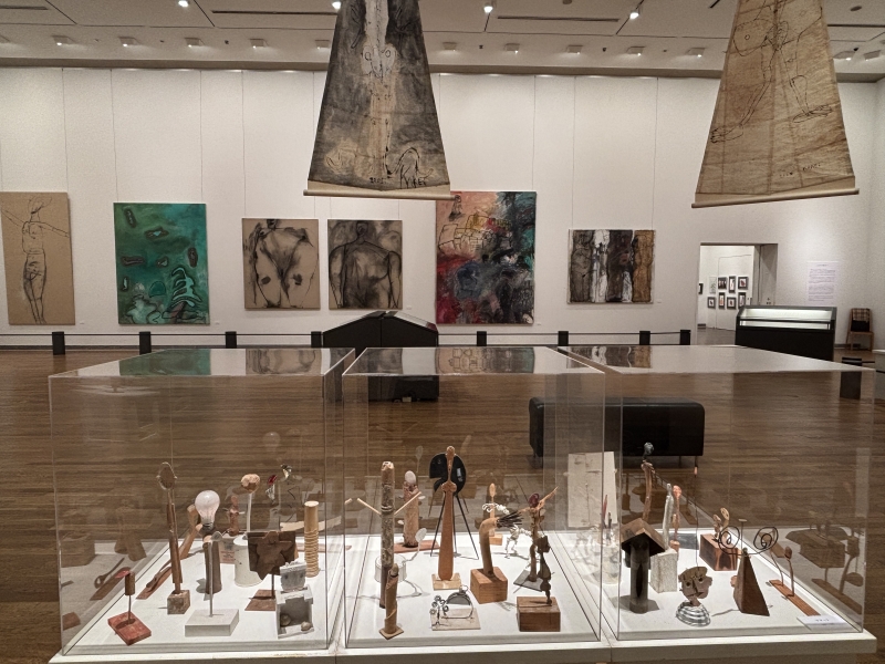 300号サイズの大きな絵画や書、木や紙を使った小さな作品の他、スケッチなどの貴重な資料も。