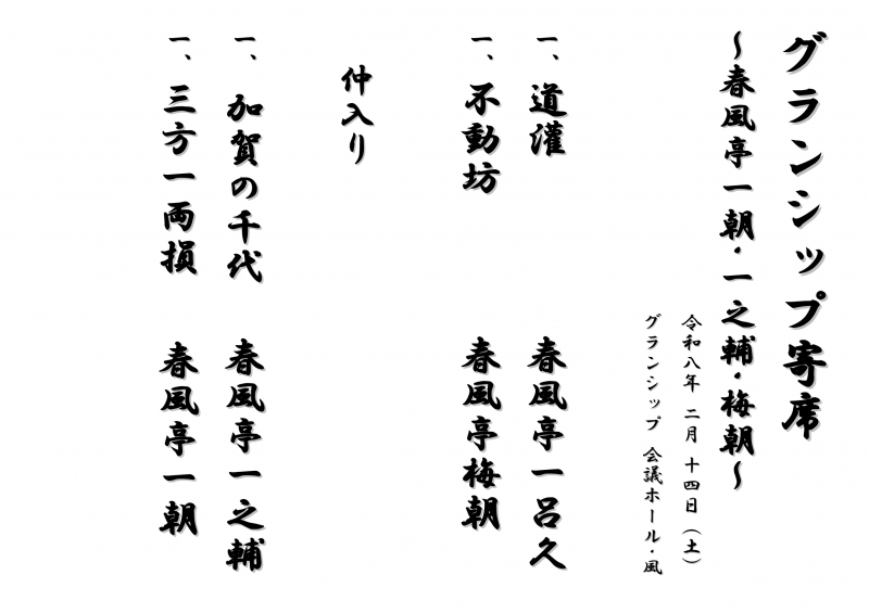 沢山のご来場、誠にありがとうございました。本日の演目をご紹介いたします。道灌 春風亭一呂久不動坊 春風亭梅朝加賀の千代 春風亭一之輔三方一両損 春風亭一朝写真:グランシップ撮影部門サポーター